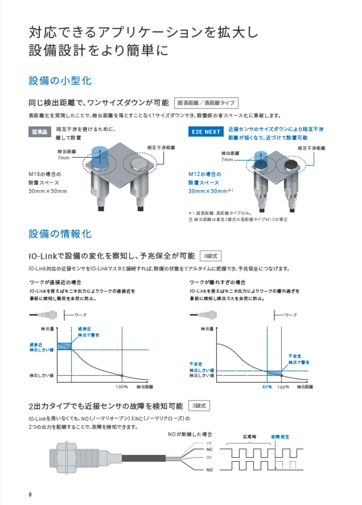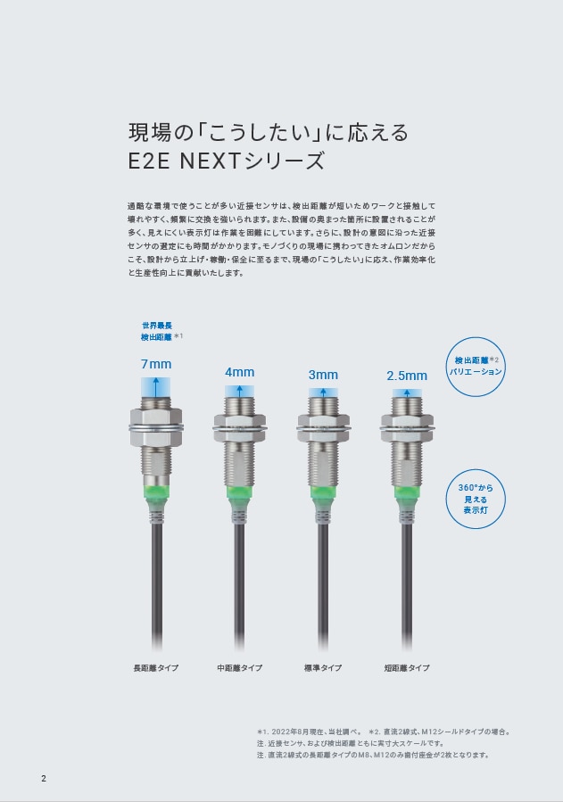 E2E NEXTシリーズの近接センサは、現場の課題に応える新基準のセンサです。世界最長の検出距離と360°視認可能な表示灯を備え、交換・設計のしやすさを向上させました。