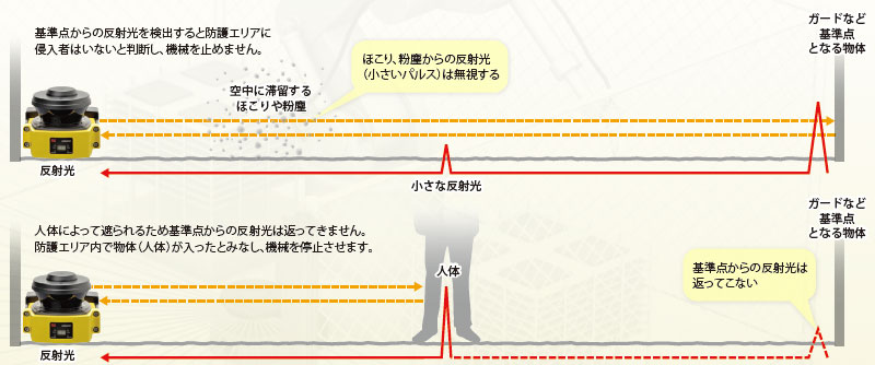 防護エリア内のほこりや粉塵に反射した小さな反射光を無視することで、汚れによる機械の予期しない停止を回避することができます。