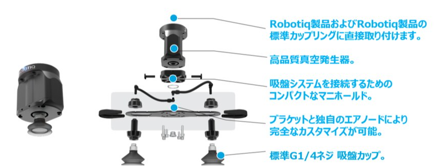 Robotiqの真空グリッパーは、 幅広い用途に対応し、ボール紙、ガラス、シートメタル(乾燥)、プラスチックなどさまざまな材質の起伏のある部品や平らな部品のピッキングに最適です。Robotiqバキュームグリッパーは、カスタマイズ可能なブラケットと独自のエアノードにより、製造上の用途に合わせて自在に制御できます。