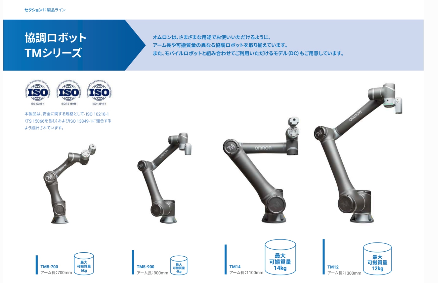 オムロンの協調ロボットTMシリーズは、アーム長や可搬質量の異なる多様なモデルを提供し、モバイルロボットとの連携も可能です。