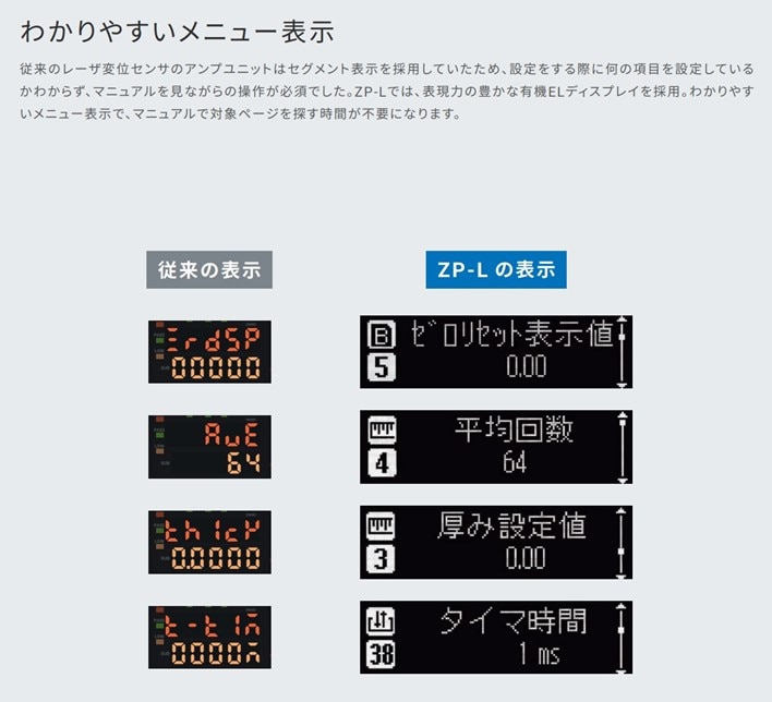 いままでのセグ表示ではどのパラメータなのか判別しにくく、マニュアルと照らし合わせながら設定を行う必要がありました。ZP-Lはアンプユニットの表示器に有機ELを採用。日本語でパラメータが表示されるのでマニュアルをみなくても設定変更が容易になりました。