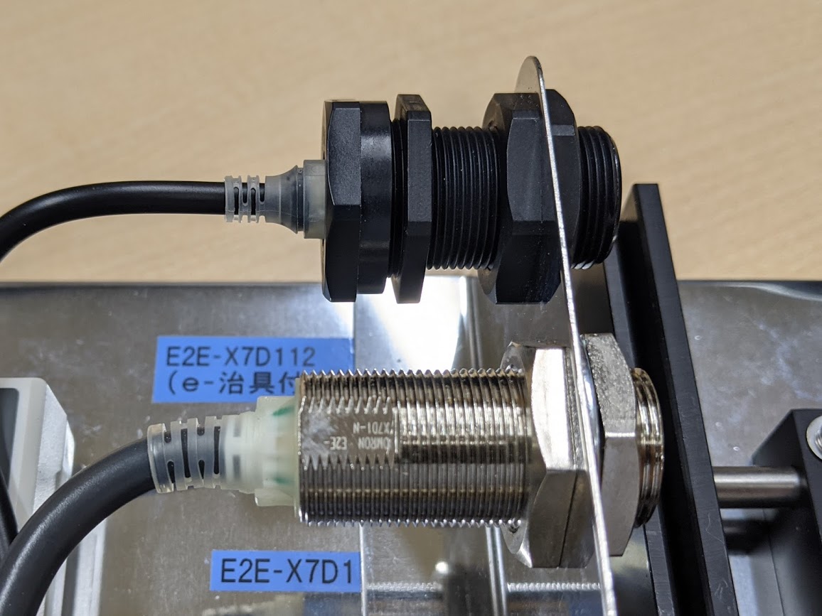 写真の上側のセンサがE2E NEXT、下側が従来の近接センサです。