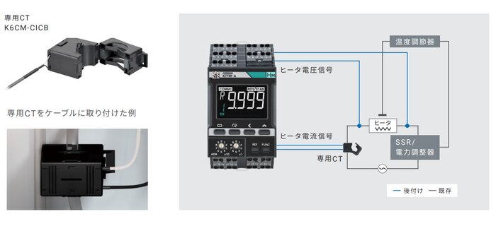 さらに、K7TMは既存の設備へ簡単に後付けすることができます。ヒータに繋がっている動力線に専用のカレントトランスをクランプして電流を計測し、ヒータ間の電圧線を繋ぐだけで1台あたり2つのヒータ状態監視を行えます。そのため、工数もそれほど気にせずに導入頂くことが可能です。